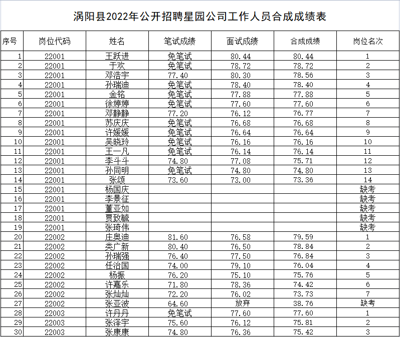 涡阳县2022年公开招聘古天乐太阳集团城工作人员合成成绩公布