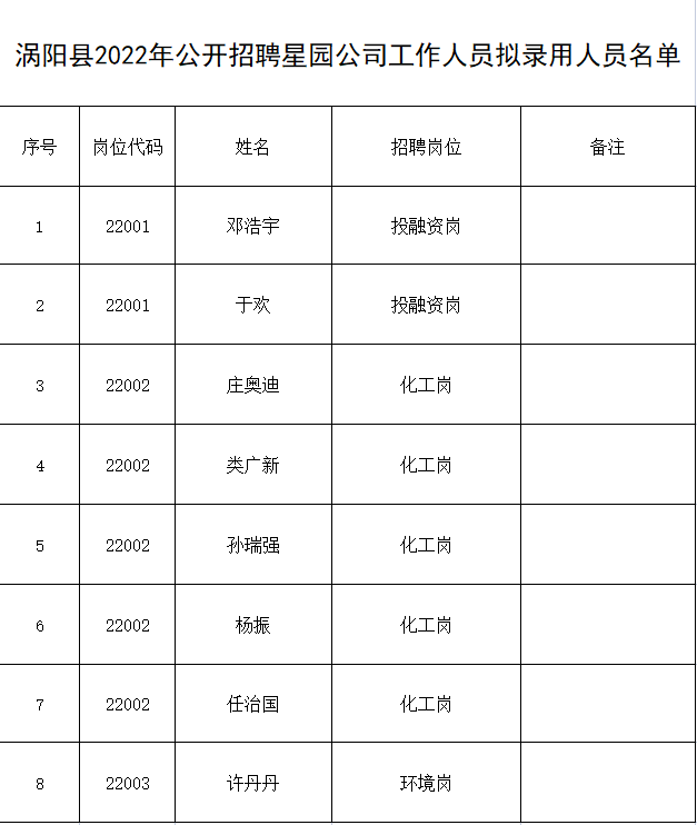 涡阳县2022年公开招聘古天乐太阳集团城工作人员拟聘用人员名单公示